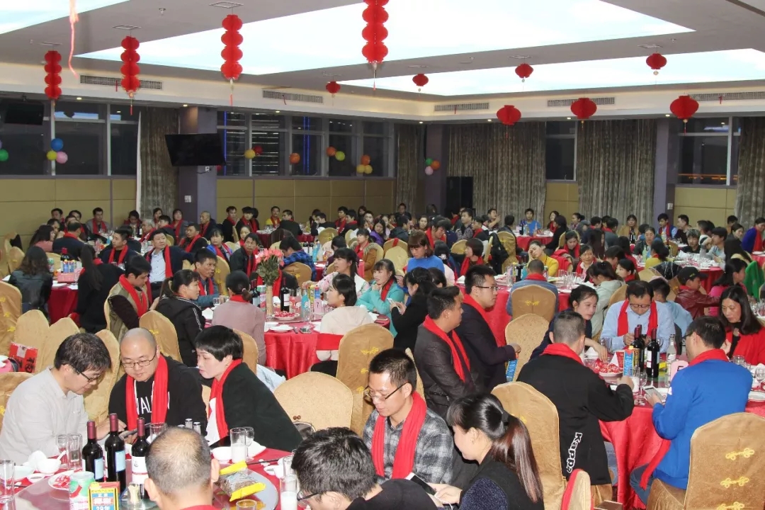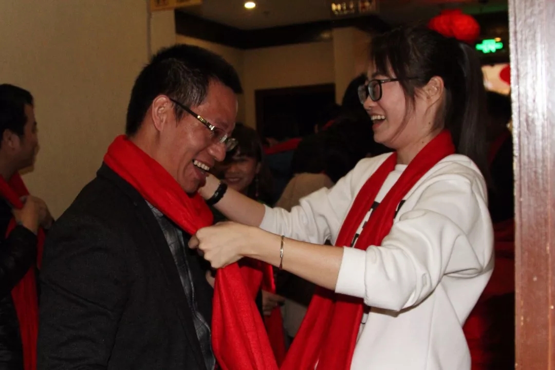 每一位到场的嘉宾及员工,首先签到,然后授予红色围巾及领取伴手礼入场,我们业务精英与客服宝贝